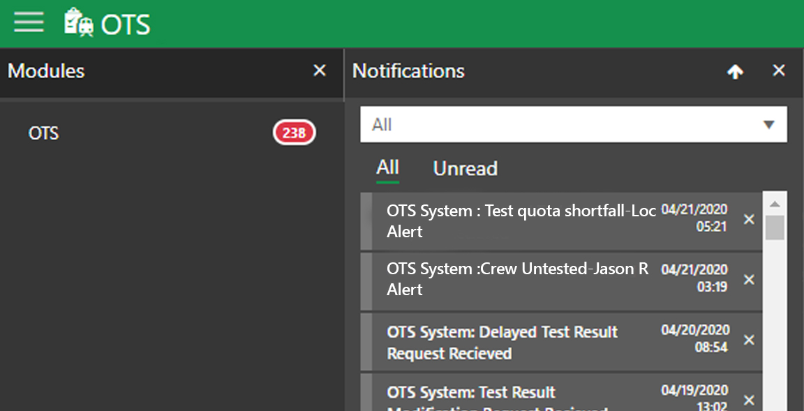 Alerts and notifications in OTS just got smarter. Testing quota shortfalls, approaching test schedules, un-tested crew members which need to be tested are now a part of the notifications package.